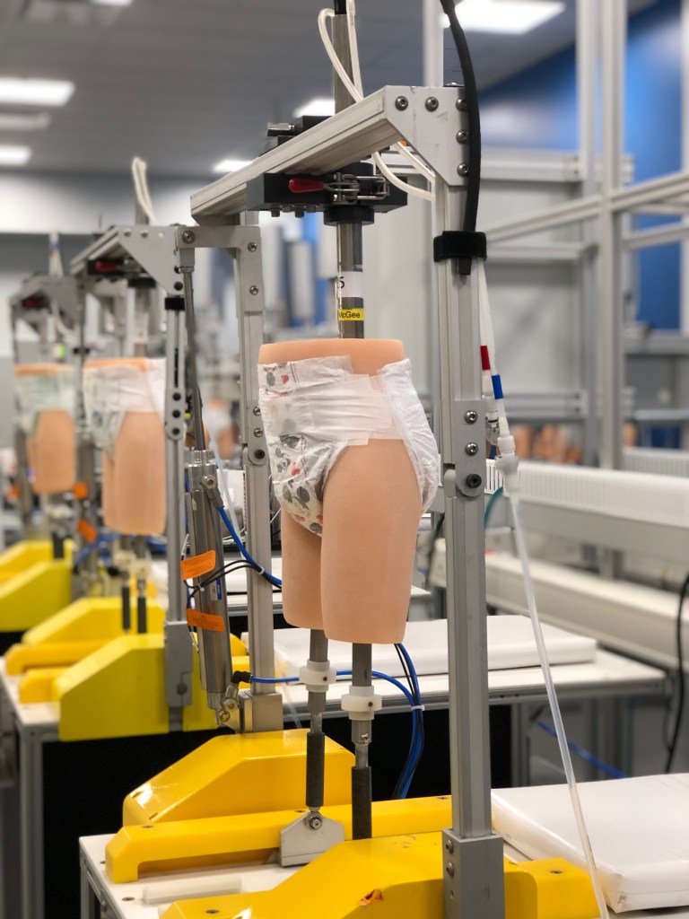 “We do a wide range of testing in the development of our diapers,” she explained. “We do modeling simulations, lab testing, testing on mannequins that mimic babies’ bodies and movement, testing with babies that come to our research centers, and real-life testing with consumers in their homes.” She said all of these methods are necessary to develop new diaper innovations.